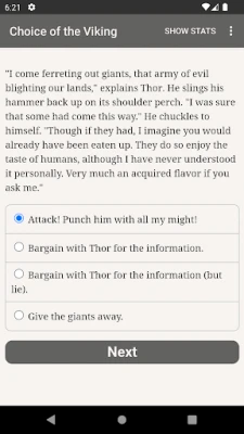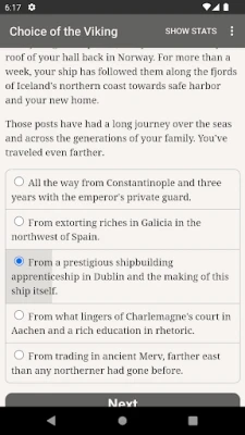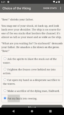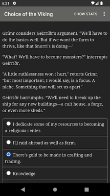 "Choice of the Viking" Declan Taggart کا پیش کردہ ایک بے مثال تاریخی فنتاسی ناول ہے، جہاں آپ کے فیصلے ہی کہانی کا رخ طے کرتے ہیں۔ یہ مکمل طور پر تحریر پر مبنی ہے، گرافکس یا صوتی اثرات سے پاک، اور آپ کے تصور کی بے پناہ، بے روک طاقت سے جنم لیتا ہے۔ یہ ناول 310,000 الفاظ پر پھیلا ہوا ہے، جو آپ کو ایک وسیع اور گہری دنیا میں غوطہ لگانے کا موقع دیتا ہے۔ سال 910 عیسوی میں قدم رکھیں، جب بے شمار وائکنگ کشتیاں شمالی یورپ کے یخ بستہ سمندروں کو چیرتی ہوئی خوش قسمتی، شان و شوکت، تجارت اور نئی زمینوں کی تلاش میں نکلتی تھیں۔ آپ کی کشتی، جس پر ناروے کے بادشاہ کی مہر ثبت ہے، آپ کے قبیلے اور آباد کاروں کو آئس لینڈ لے آئی ہے، ایک ایسی سرزمین جہاں آپ کو بنجر زمین سے کچھ نیا تعمیر کرنے کا موقع ملا ہے۔